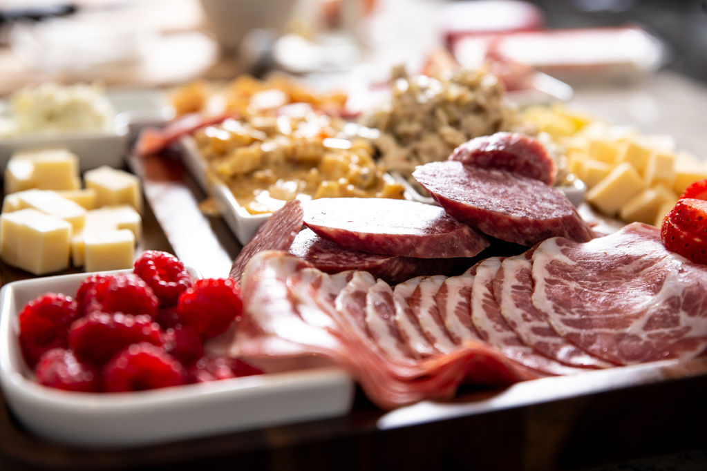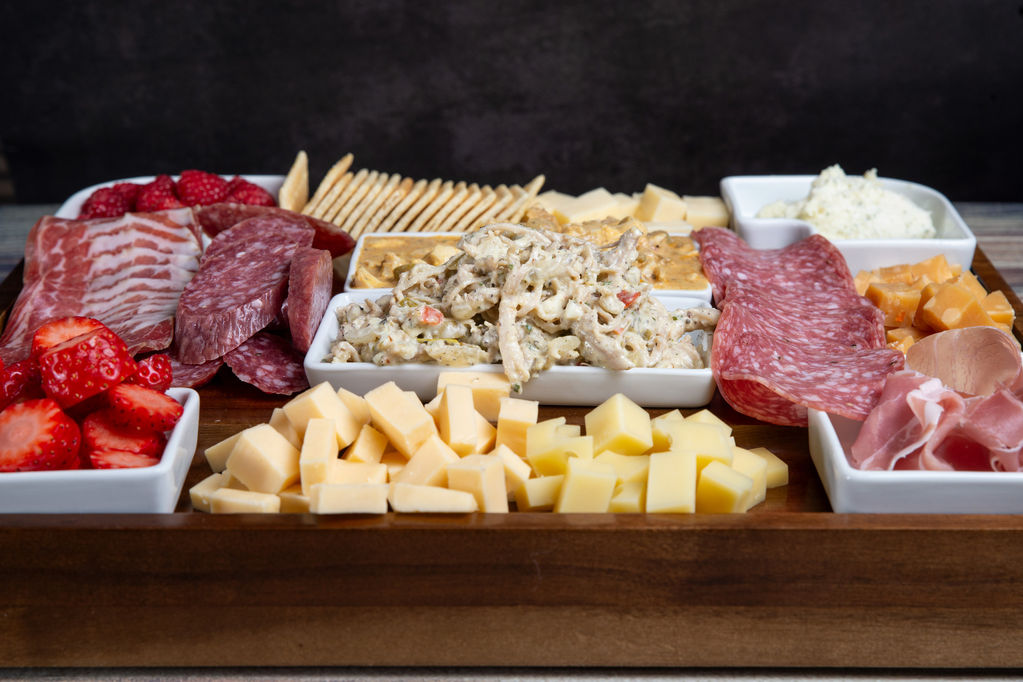 Delight in chef-signature egg and chicken salad, an array of four exquisite cheeses, three varieties of expertly smoked meats, delectable olives, a trio of indulgent jams, a delightful assortment of mixed nuts, succulent dried fruits, and crispy crackers. Order now and treat yourself to a symphony of flavors that will leave you craving more.